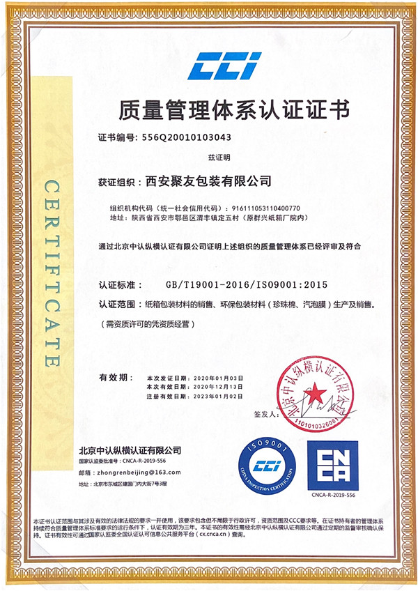 质量管理体系认 证证书